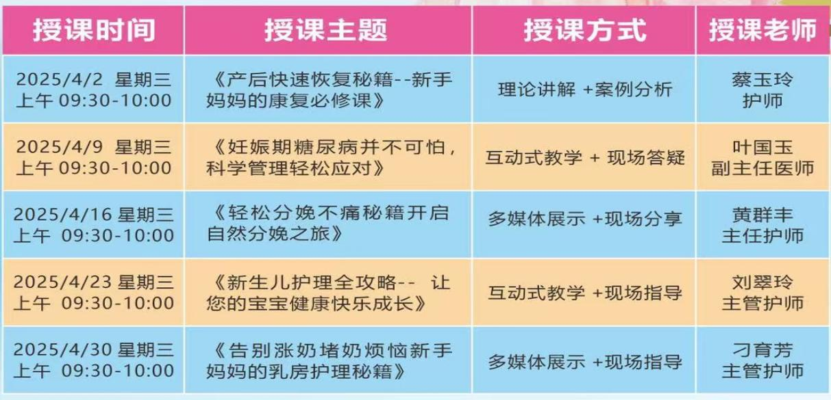 四月孕妇学校课程安排已出炉!由资深医护团队授课,涵盖产后康复、孕期疾病管理、分娩减痛技巧、新生儿护理等实用内容,助您轻松度过孕期,迎接健康宝宝!