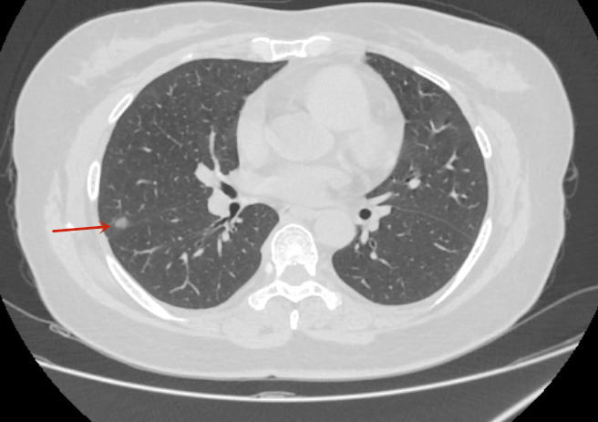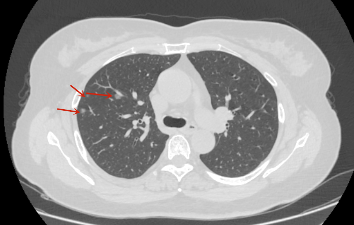 ▲胸部CT是右上肺、右中肺多发肺结节(箭头所示)