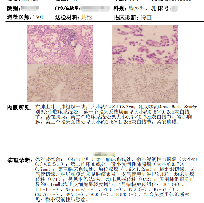 2.多发结节更需关注。约10%-20%的多发结节为多原发肺癌,可能与遗传、长期吸烟、空气污染等因素相关。微小浸润性腺癌(如案例中的病理类型)属于早期肺癌,手术治愈率超95%。