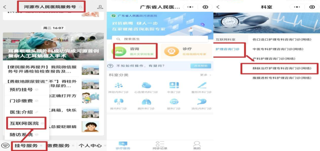 关注“河源市人民医院服务号”,点击挂号服务→互联网医院→咨询→护理咨询门诊→静脉治疗护理专科门诊(网络)→添加就诊人→填写个人就诊信息→挂号,即可线上咨询。