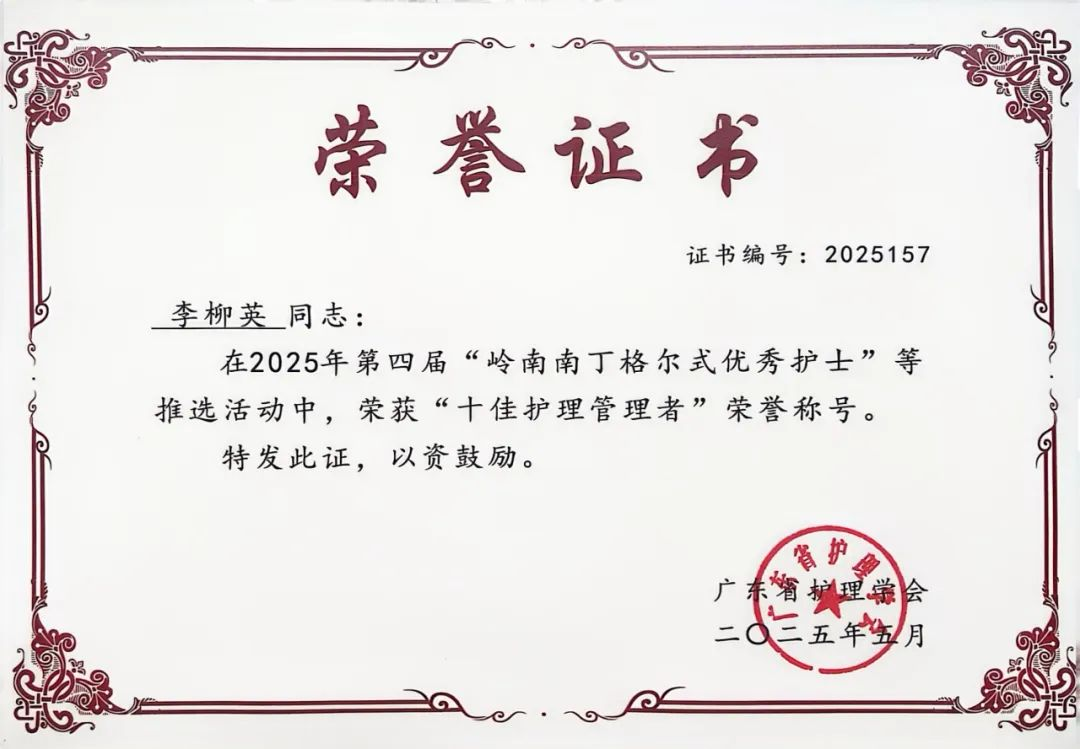 此次获得的省级荣誉,既是对李柳英主任管理能力的认可,也是对我院护理团队共同努力的鼓励,在李柳英主任的带领下,我院护理团队将持续深化护理服务内涵建设,推动护理学科的高质量发展,为提升河源地区人民群众健康贡献护理力量。