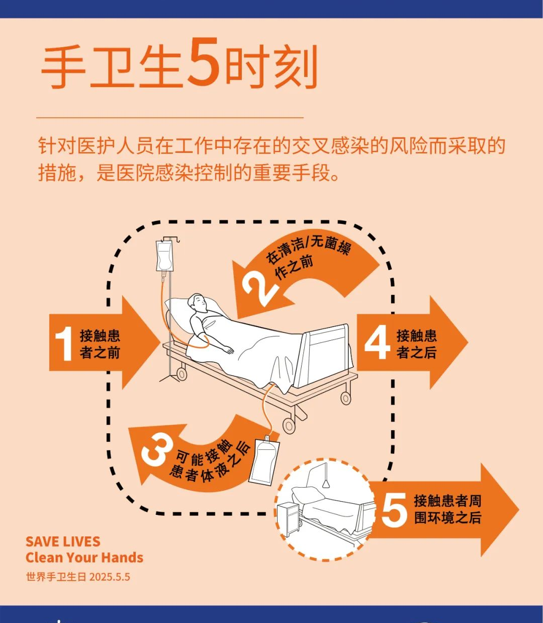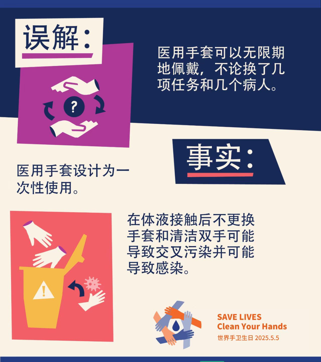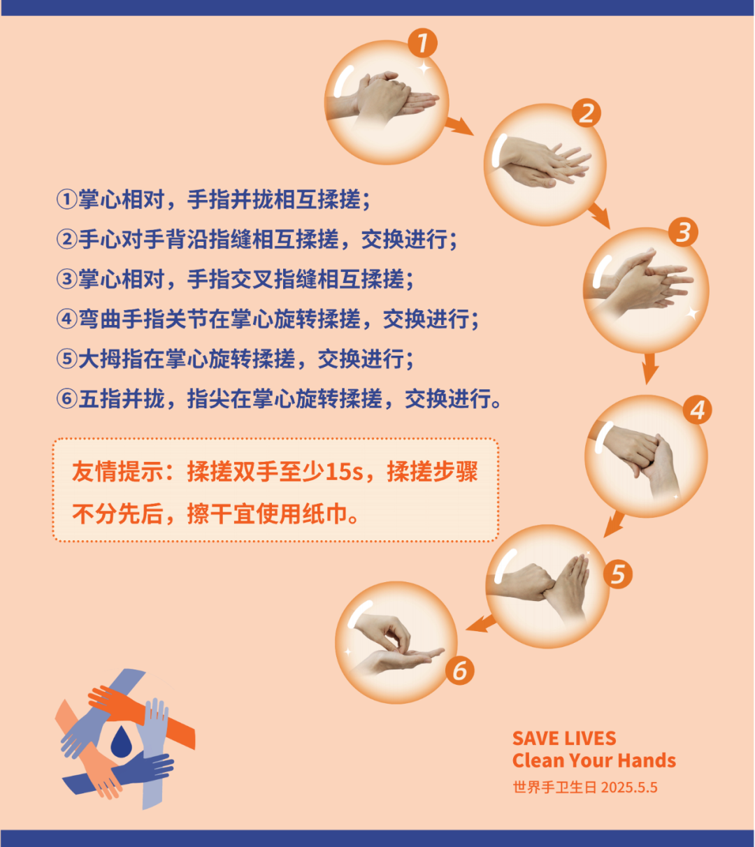 2025年5月5日是第17个世界手卫生日,全球医疗机构共同响应WHO的号召,用行动践行“清洁双手,拯救生命”的承诺。今年主题是:“合理使用手套,关键永远是手卫生”(It might be gloves. It's always hand hygiene)。强调手卫生是“永远的关键”,手套的“合理使用”需以手卫生为前提。手卫生始终是感染防控的核心措施,手套的使用不能替代手卫生。