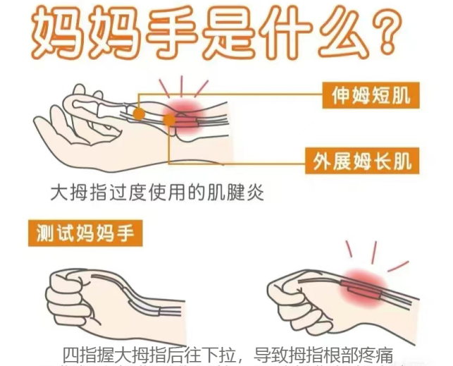 “妈妈手”是手腕桡骨茎突处腱鞘在频繁活动、过度摩擦下产生炎症,腱鞘增厚、狭窄压迫肌腱,引发疼痛与功能障碍。主要症状为手腕桡侧(大拇指一侧)疼痛,活动手腕、用力握拳或伸拇指时疼痛加剧,可放射至手部或前臂,桡骨茎突处能摸到压痛明显的小结节。病情发展会导致手腕活动受限,影响手部正常功能。随着病情发展,手腕活动受限,握拳、伸拇指以及手腕向尺侧(小拇指一侧)偏斜等动作,都会引发剧烈疼痛,严重影响手部正常功能,连给宝宝穿衣服、拿奶瓶这些简单动作都难以完成。