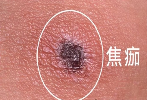 2.黑色焦痂。恙虫喜欢叮咬人体湿润、气味较浓的部位,如腋窝、腹股沟、外生殖器、腰、背、耳后等。在被恙螨叮咬的部位,会出现一个圆形或椭圆形的溃疡,表面还会结一层黑色的痂皮,这就是恙虫病特有的黑色焦痂。需要特别注意的是,这个痂皮千万不能随意抠挠,否则可能导致感染扩散,加重病情。黑色焦痂的形成,是由于恙螨叮咬人体时,会注入一种含有多种酶和毒素的唾液,这些物质会破坏人体局部组织细胞,导致组织坏死,进而形成溃疡和焦痂。