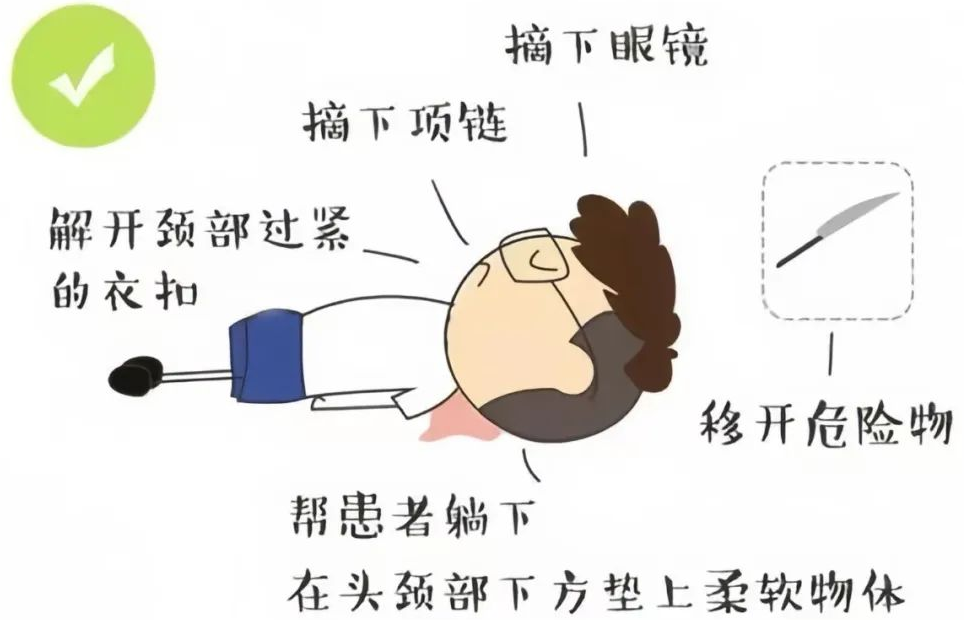 ①保持冷静,维持周围环境安全。旁人首先要保持冷静,避免因为恐慌而采取错误的急救措施。有发作先兆时迅速协助患者平卧床上或就近躺在平整安全的地方,在头颈部下方垫软物,防止突然倒地而摔伤头部及身体,并迅速移开附近可能造成患者受伤的物品。