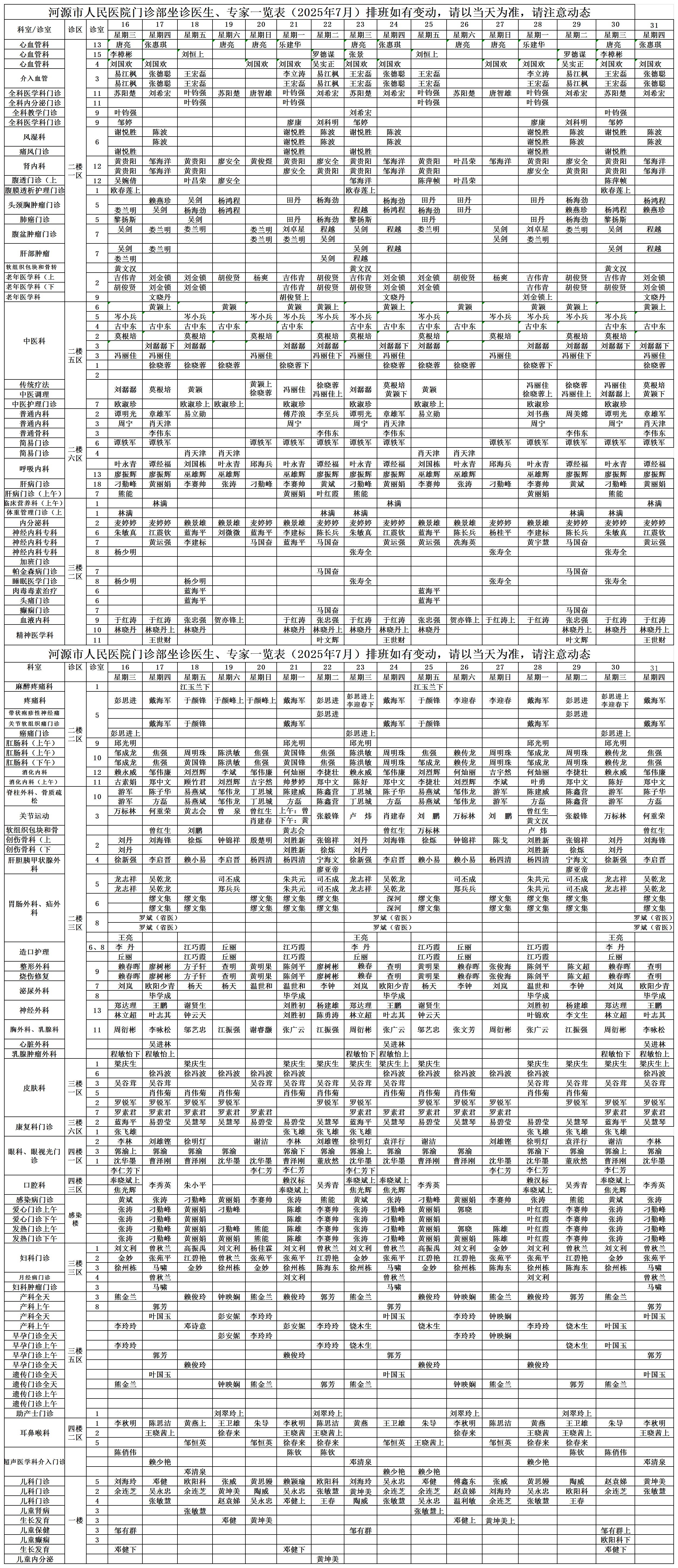 河源市人民医院门诊部坐诊医生、专家一览表(2025年7月)