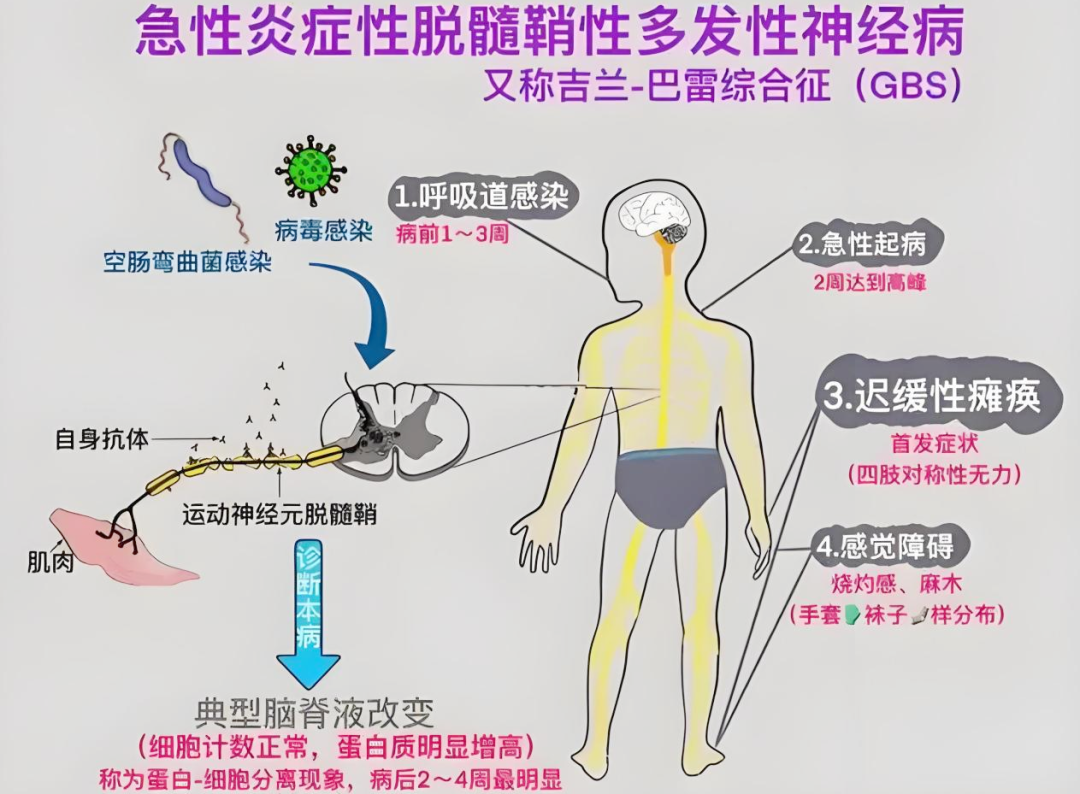 GBS是一种自身免疫性疾病,因免疫系统错误攻击周围神经(如运动神经、感觉神经),导致肌肉无力、麻木甚至瘫痪。多数患者在发病前1-3周有呼吸道或胃肠道感染史(如感冒、腹泻),可能与感染后免疫紊乱有关。