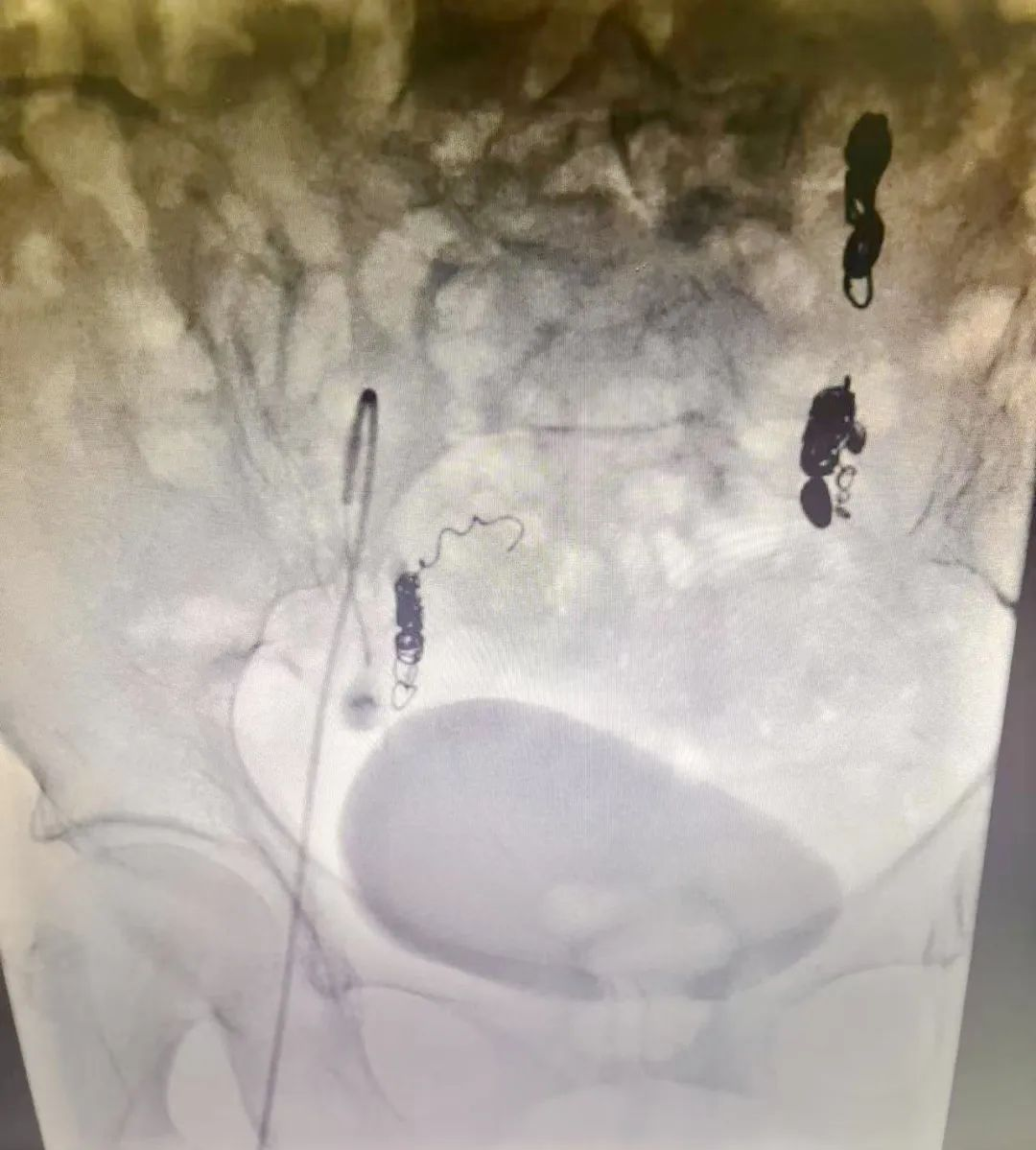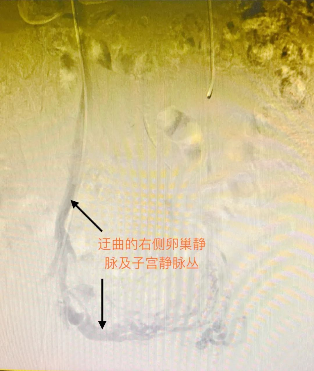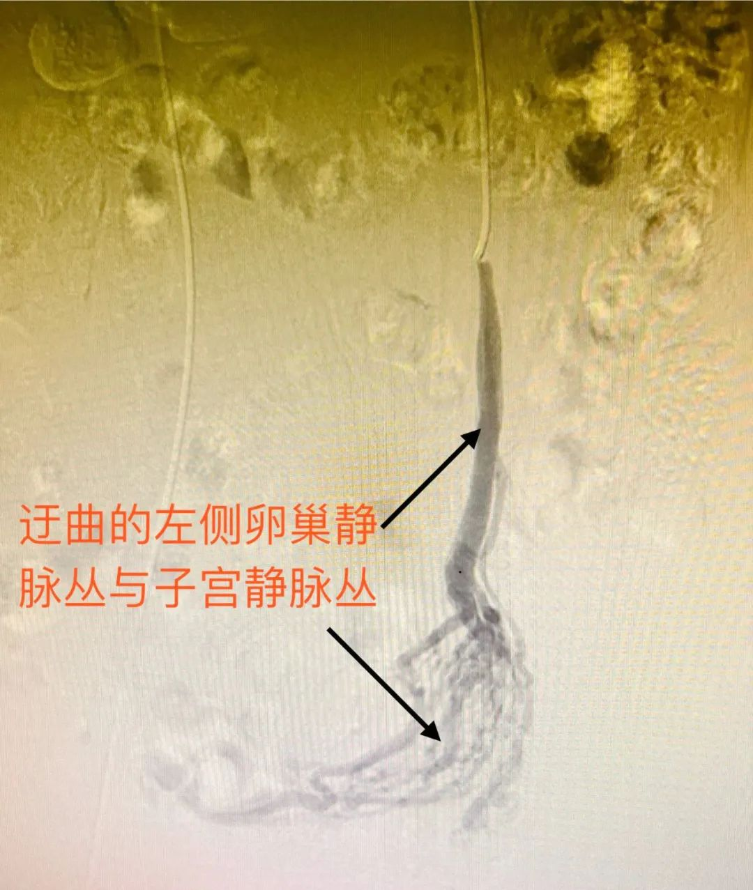 我科积极进行术前准备,完善患者的术前检查,择期安排患者行介入手术治疗,术中造影显示盆腔静脉迂曲扩张并有丰富的交通支。