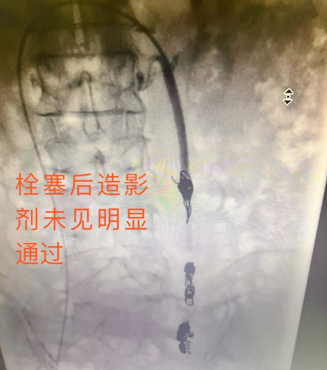 术中找到并弹簧圈栓塞迂曲扩张的左侧卵巢静脉,并栓塞右侧迂曲扩张的子宫静脉,栓塞后再次造影,未见造影剂滞留。