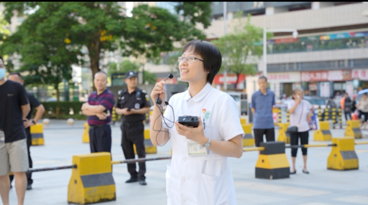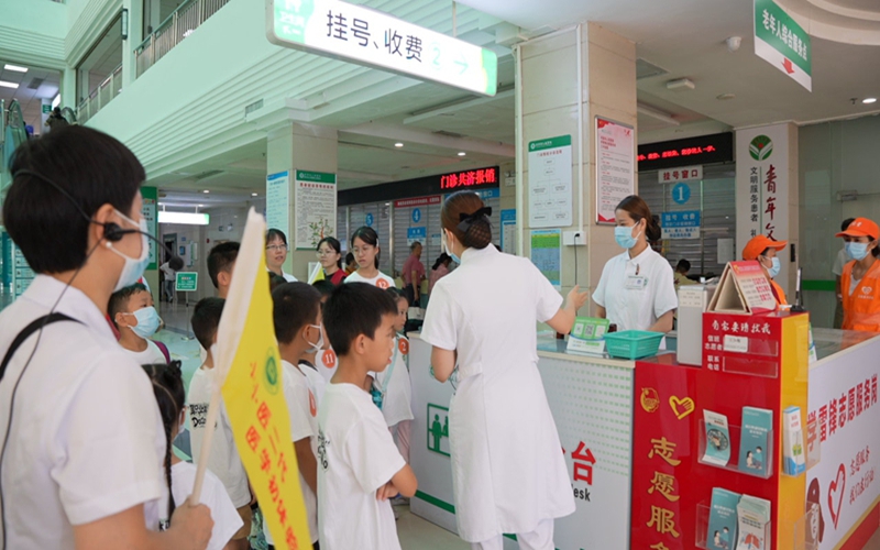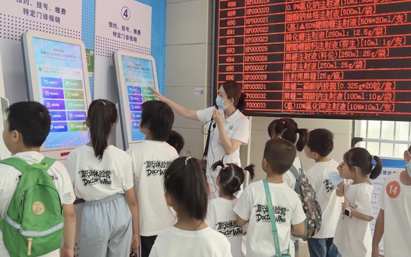 在门诊客服中心刘晓丹护士的讲解下,第一组孩子亲手操作自助挂号机,体验一站式服务流程,不时发出“原来爸爸妈妈每天要帮助这么多人”的惊叹,在互动中直观感受门诊工作的繁忙与意义。