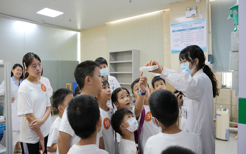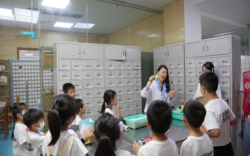 西药房内,何利庭药师结合日常讲解药品分类与安全用药知识,用通俗语言解读药盒标识、有效期等要点;黄俊杰药师演示自动发药机的智能流程,机器快速分拣药品的场景,让孩子们惊叹于发药效率。