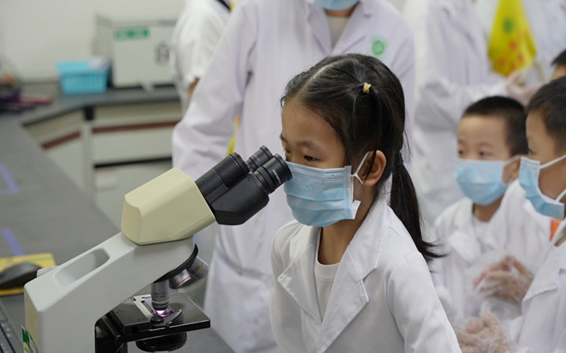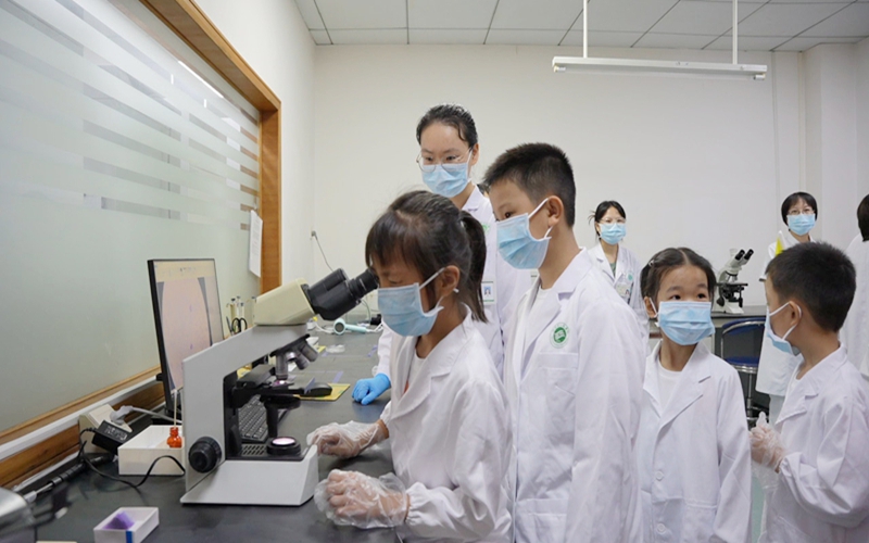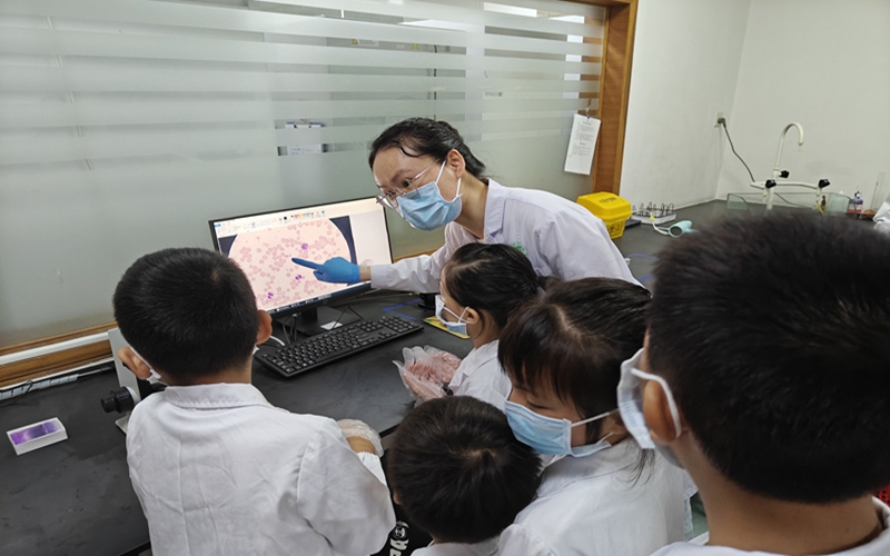 检验科内,孩子们换上定制白大褂,瞬间有了“小医生”的模样。邱瑞婷医生引导大家轮流在三台显微镜前观察:当白细胞的不规则轮廓、红细胞的透亮形态在视野中浮现时“哇,像红色的小饼干!”“这个白细胞好像在动!”的惊叹声不断。大肠杆菌的杆状身影、葡萄球菌聚成的“小葡萄串”让孩子们瞪大了眼睛:“原来让人生病的细菌长这样!”