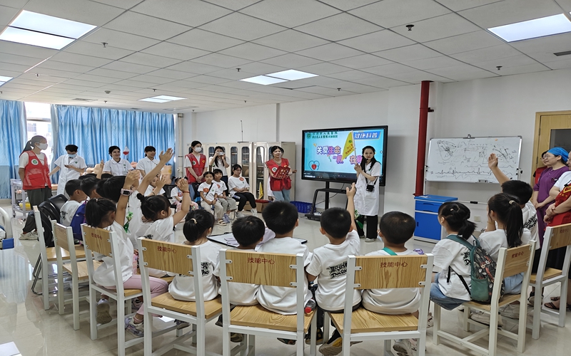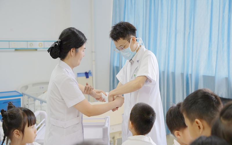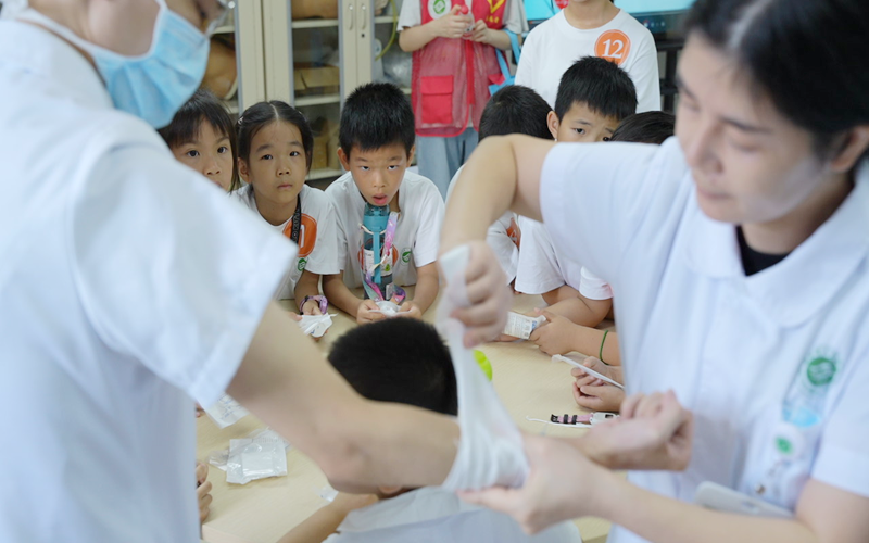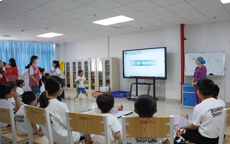 技能培训中心里,急救体验正热闹开展。急诊科副护士长张仁芳先示范伤口包扎技巧,绷带在她手中灵活翻转,转眼就完成固定。孩子们两两结对模仿,你帮我缠纱布,我给你系结,学得有模有样,笑声里藏着专注。另一边,ICU团队用动画视频讲清心肺复苏的原理,再拿教具演示按压部位、力度和频率。“双手交叉按这里,要像按小气球一样有节奏哦”,志愿者“一对一”纠正动作:“手肘再伸直些”“速度可以再稳点”。萌娃们跪在垫子上,小胳膊用力按压,额角渗着细汗也不停歇。神经内科刘医生远远看着儿子标准的按压姿势,忍不住笑说“这认真劲儿,比我第一次练得还好!”