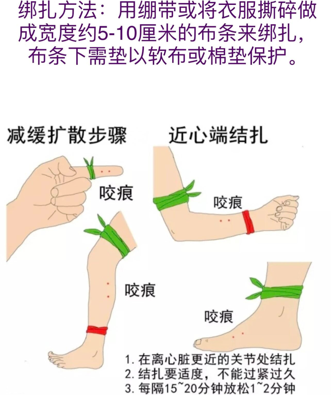 1.保持冷静。被蛇咬伤后,情绪要平稳,切勿惊慌奔跑,因为剧烈运动、情绪激动会加速血液循环,促使毒素更快扩散。
