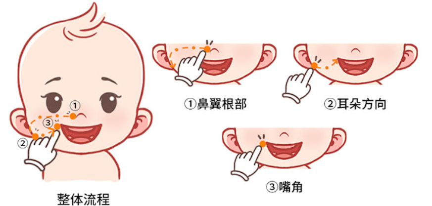 ①将食指放在宝宝鼻翼根部,边轻压边将手指向耳朵方向移动,并弧形向下,向嘴角形成C字形按压。