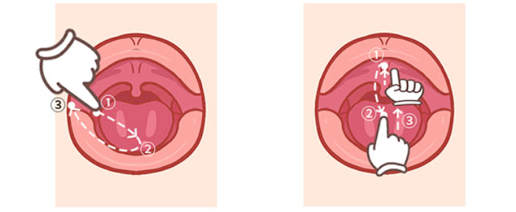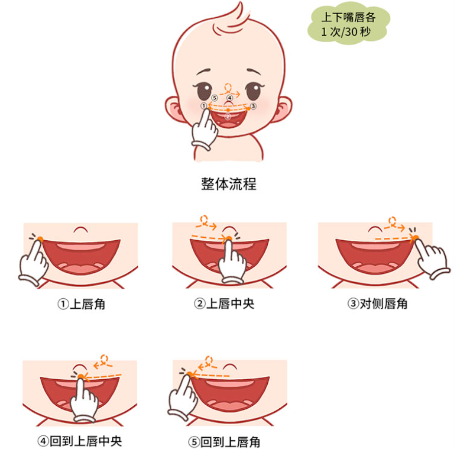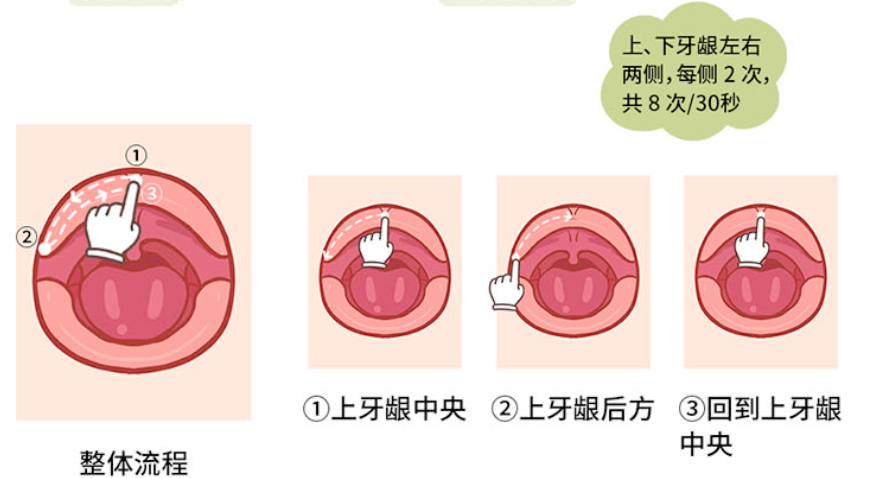 ①将手指放在上牙龈中央,用恒定持久的力量缓慢轻柔地移向牙龈后方,以同样的方式移回到上牙龈中央。