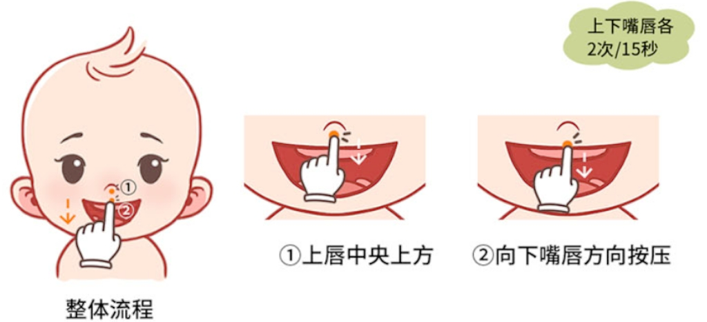 ①将食指放在唇中央,用轻柔持续的力量将上唇缓慢向下嘴唇方向按压。