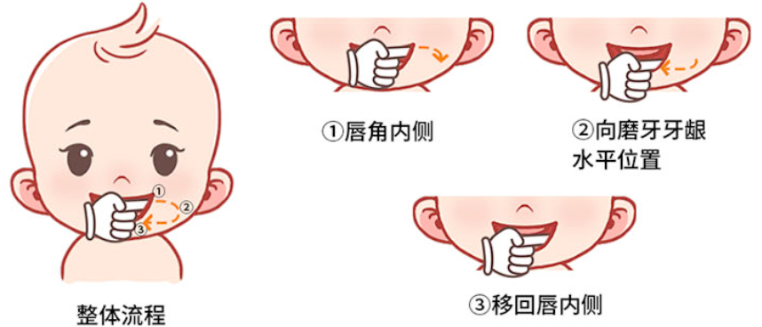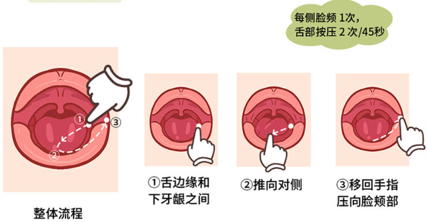 ①将手指放在磨牙牙龈水平处的舌边缘和下牙龈之间,用轻柔的力量缓慢地将舌推向对侧,立即移回手指,并将手指轻轻压向婴儿的脸颊部。