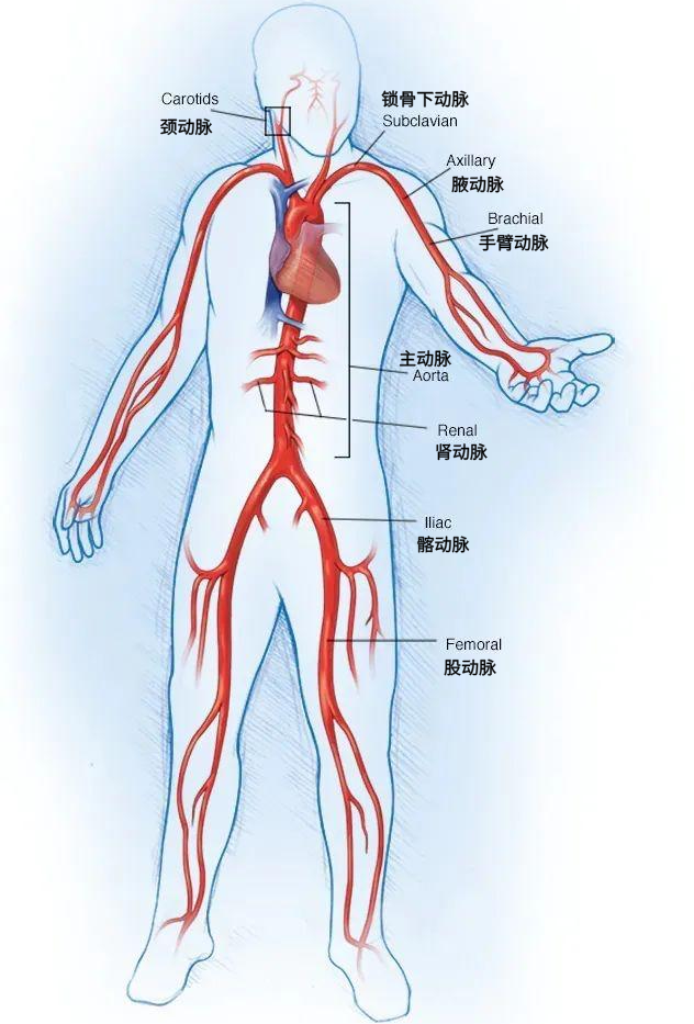 ▲大动脉炎可累及全身多处动脉,引起对应部位、器官的损害
