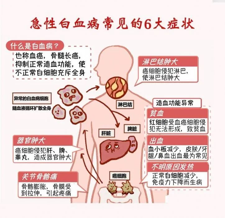 白血病俗称“血癌”,源于体内造血干细胞发生恶性克隆性增殖。其发病急骤,病情进展迅速,常表现为发热、贫血、出血、淋巴结肿大等,若不及时治疗,可随时危及生命,经过积极治疗,部分患者可得以延长生命。