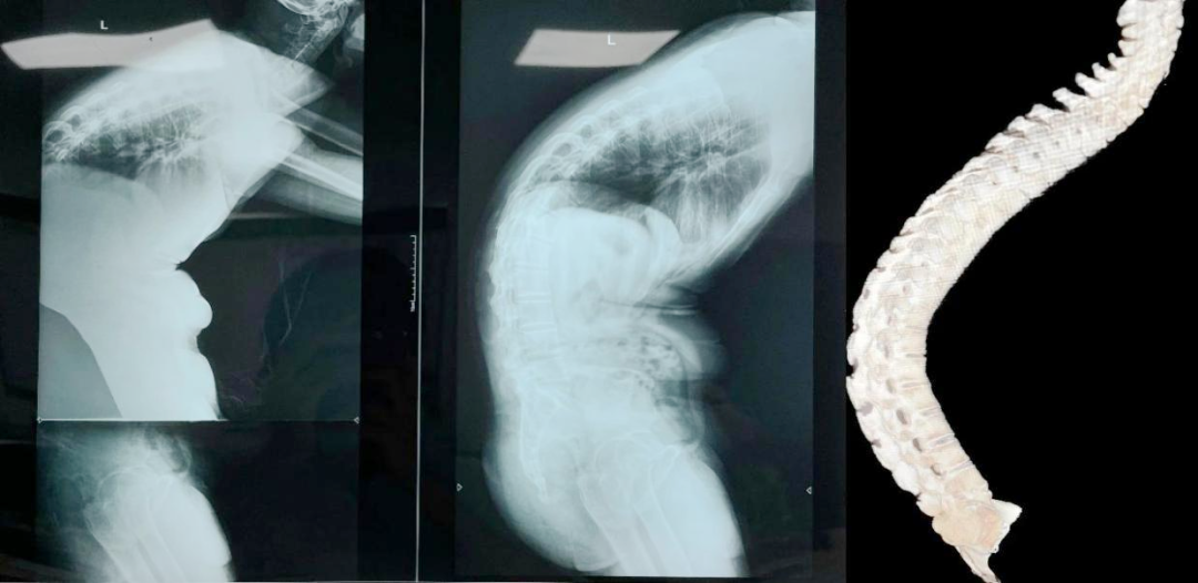 ▲术前:术前正侧位,脊柱后凸CObb角70°