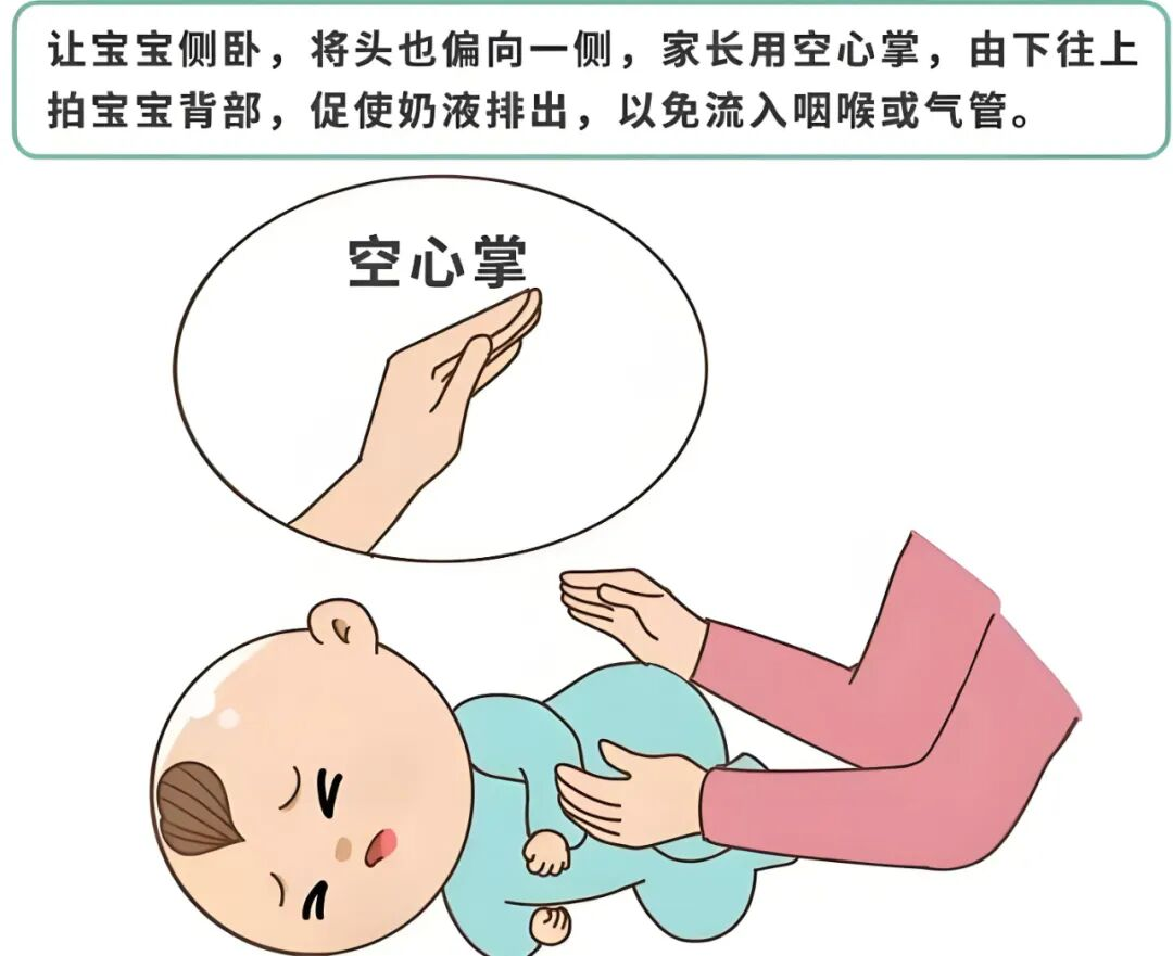 再翻过来按压:把宝宝翻到另一侧手臂上,观察是否有奶液流出;若还是没反应,用两根手指在宝宝两乳头连线中点,快速按压5次;