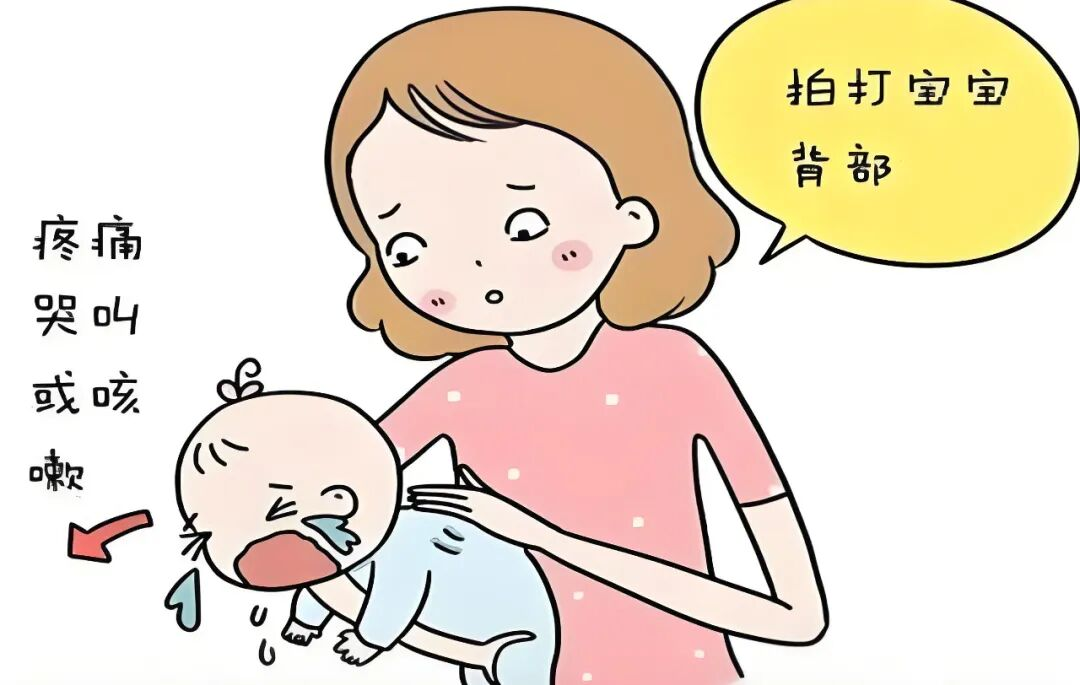 先“飞机抱”:让宝宝趴在你的手臂上,头低臀高,用手掌根部在他肩胛骨连线处叩击5次;