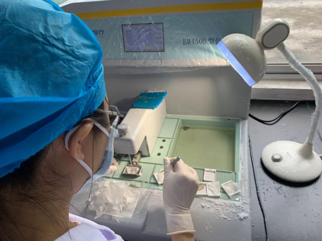 3.组织处理与制片。技术员对组织进行固定、脱水、透明、浸蜡、包埋、切片、染色(常规HE染色),制成高质量玻片。其中应用到切片机2台、包埋机1台、全自动染色机1台等医疗器械。