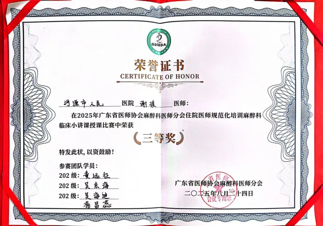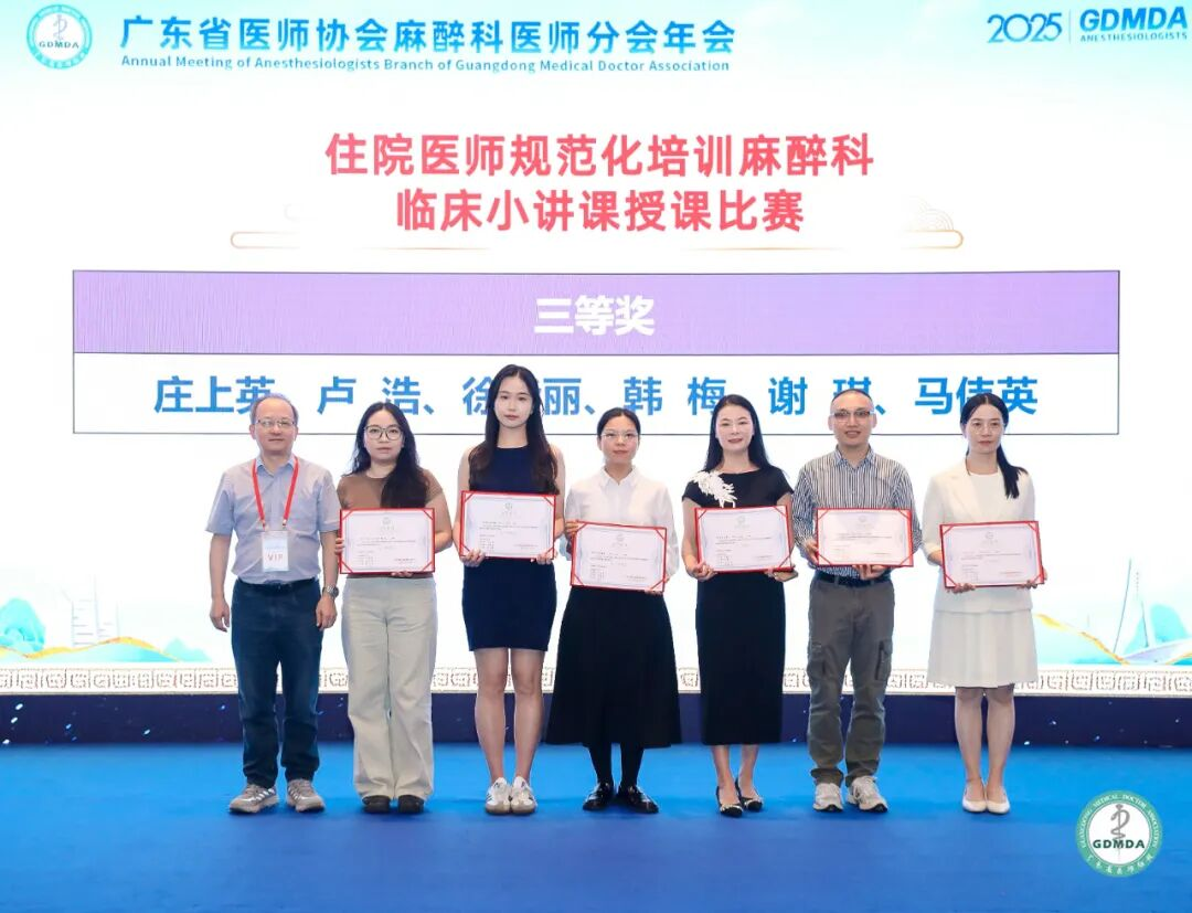 近日,2025年广东省医师协会麻醉科医师分会年会传来捷报,我院麻醉科基地的谢琪主治医师团队荣获2025广东省麻醉专业指导医师临床小讲课教学能力大赛三等奖。同时,麻醉科基地秘书戴海军主治医师也带领住培学员们在麻醉危机资源管理工作坊比赛中展现了良好的团队协作与应急处置能力,获得了在场评委及同行的好评。