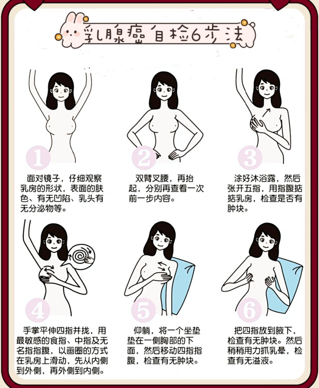 女性朋友可以每个月自己检查乳房,最好在月经结束后一周左右进行。检查时站在镜子前,看看两侧乳房大小、形状是否对称,皮肤有没有像橘子皮一样的改变,乳头有没有凹陷或溢液。然后用手指指腹轻轻按压乳房,从外到内、从上到下按顺序检查,感受有没有肿块。