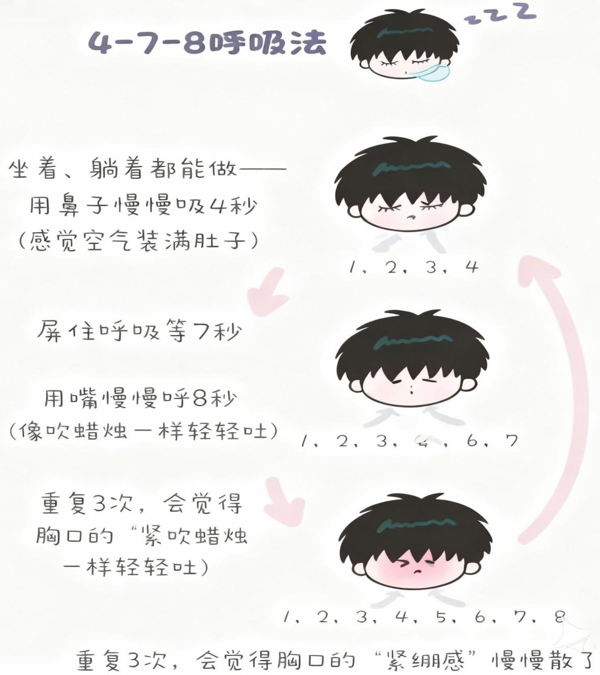 1.试试“478呼吸法”。坐着、躺着都能做——用鼻子慢慢吸4秒(感觉空气装满肚子),屏住呼吸等7秒,再用嘴慢慢呼8秒(像吹蜡烛一样轻轻吐),重复3次,会觉得胸口的“紧绷感”慢慢散了。