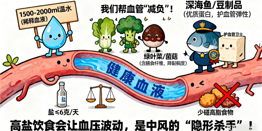 提示:每天喝1500-2000ml温开水能稀释血液,防止血液变粘稠,多食蔬菜:像菠菜、西兰花、木耳这些食材,能帮血管 “减负”;而高盐、高脂饮食会让血压波动,是中风的 “隐形杀手”。