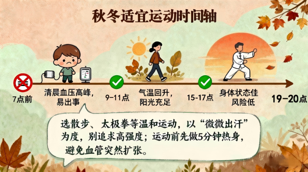 提示:建议以中-低强度、能持续一定时间的有氧运动为主,如:快走、慢跑、太极拳、八段锦、瑜伽、健身操等,另外单脚站立、脚跟对脚尖行走有助于预防跌倒。晚间19-20时如果天气冷、下雨或风大可根据自身情况选择室内运动。运动不但增强体质,预防感冒,同时促进血液循环,减少脑中风的发生。