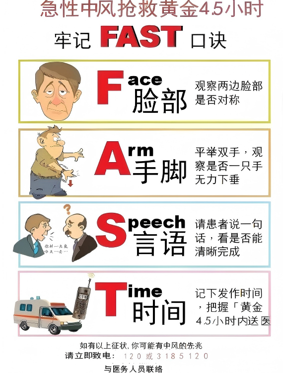 提示:缺血性中风在发病4.5小时内做溶栓或取栓治疗,能最大程度减少后遗症;出血性中风更要争分夺秒送医。记住:时间就是大脑,每延迟1分钟,就有190万个脑细胞死亡。