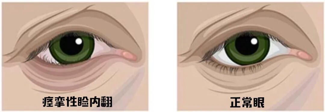 老年性睑内翻又叫痉挛性睑内翻或退行性睑内翻,多发生于下睑。是由于下睑缩肌无力,眶隔和下睑皮肤松弛失去牵制睑轮匝肌的收缩作用,以及老年人眶脂肪减少,眼睑后面缺少足够的支撑所致。各种因素刺激,如结膜炎、结膜异物、角膜炎等容易引起眼轮匝肌、特别是近睑缘的轮匝肌反射性痉挛,导致睑缘向内翻转形成睑内翻。