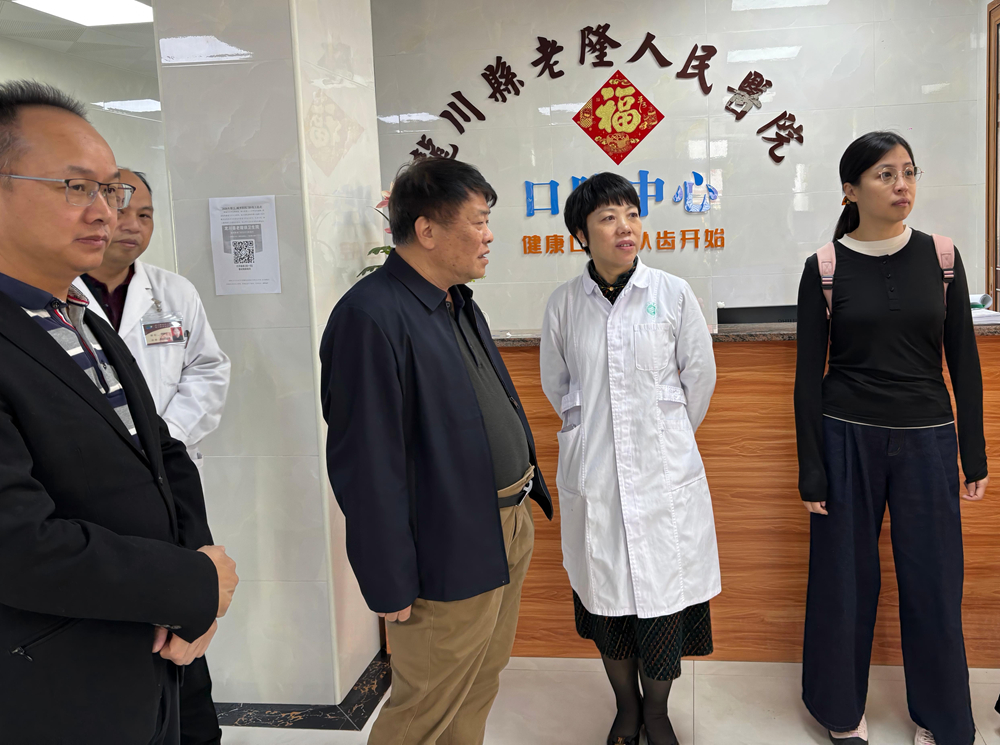 ▲龙川县老隆人民医院院长巫周水(右三)带领专家团队参观口腔中心