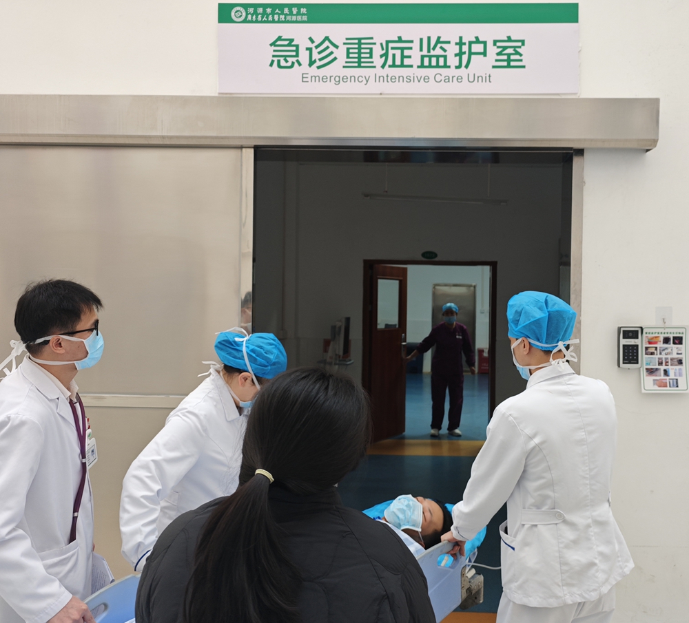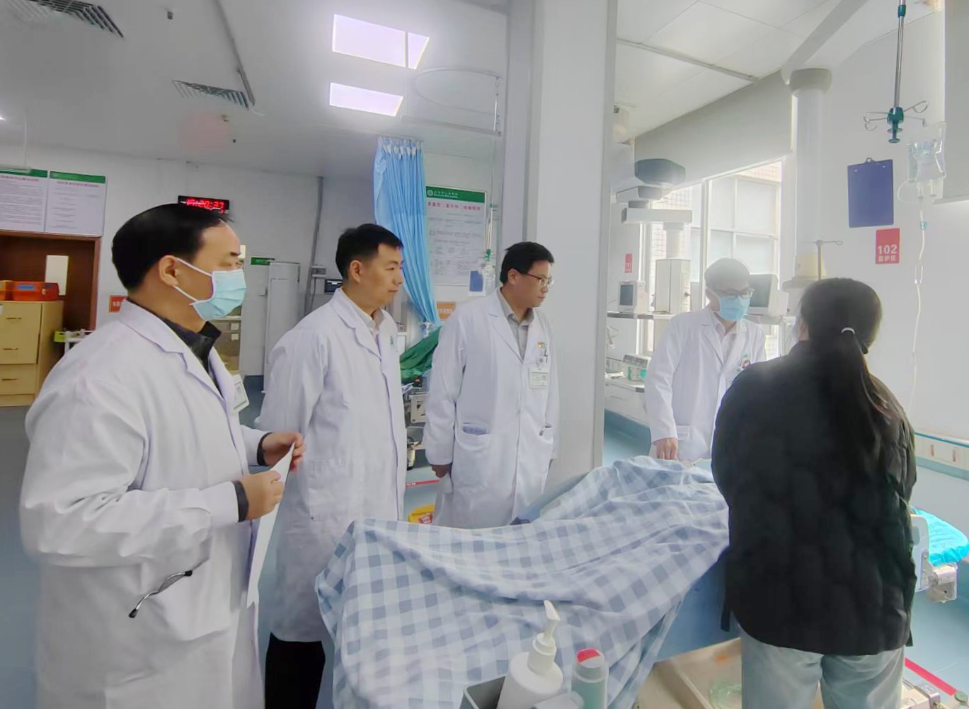 ▲丁美祥副院长、医务部负责人刘恒、急诊医学科主任章雄军参与抢救重症患者