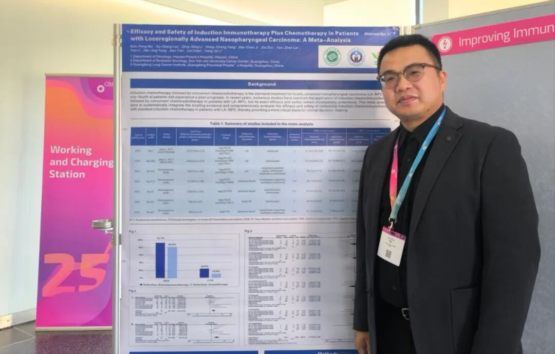 医学探索永无止境,突破自我才能抵达更高峰。从最初覆盖多系统的大肿瘤方向,到逐步聚焦头颈胸部肿瘤亚专科,吴昆鹏始终以患者需求为导向,不断细化专业领域。随着鼻咽癌发病率在中国南方居高不下,且诊疗过程中存在诸多难点,他毅然将鼻咽癌作为核心主攻方向,开启了“精准攻坚”之路。凭借扎实的专业功底与不懈的探索精神,他在鼻咽癌根治同步放化疗联合免疫治疗形成创新性应用模式,系列相关研究成果成果《免疫治疗联合化疗诱导治疗局部晚期鼻咽癌的真实世界研究》《免疫治疗联合化疗诱导治疗在局部晚期鼻咽癌有效性及安全性循证医学分析》相继在2024年欧洲肿瘤内科学会亚洲年会(ESMO-Asia)和2025年德国美因茨欧洲癌症免疫治疗协会年会(CIMT)等国际肿瘤学会议进行学术交流,并发表在国际肿瘤学期刊《British Journal of Cancer》及《Annals of Medicine》。鼻咽癌的诊疗成果不仅体现在学术层面,更切实改善了患者的治疗效果与就诊体验。通过回顾近年我院鼻咽诊疗数据:(1)我院早期鼻咽癌患者治愈率达100%,实现精准治疗零复发。(2)对于局部晚期鼻咽癌患者3年无复发转移率>85%,3年生存率>95%,疗效达省内领先水平。(3)依托我院成熟的临床诊疗流程及先进诊疗理念,鼻咽癌患者无需辗转广深,在家门口即可完成长达近2个月的放射治疗,医疗费用降低30%,显著切实减轻患者身心与经济负担。