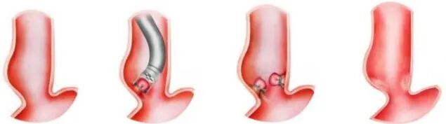 “缝合收紧”:通过负压吸引将松弛的贲门黏膜吸入套扎器,然后释放一枚或数枚套扎环配合组织夹,像“给衣服收腰”一样,使松弛的贲门黏膜产生折叠和瘢痕化修复,从而有效缩窄贲门周径,恢复其“阀门”功能。