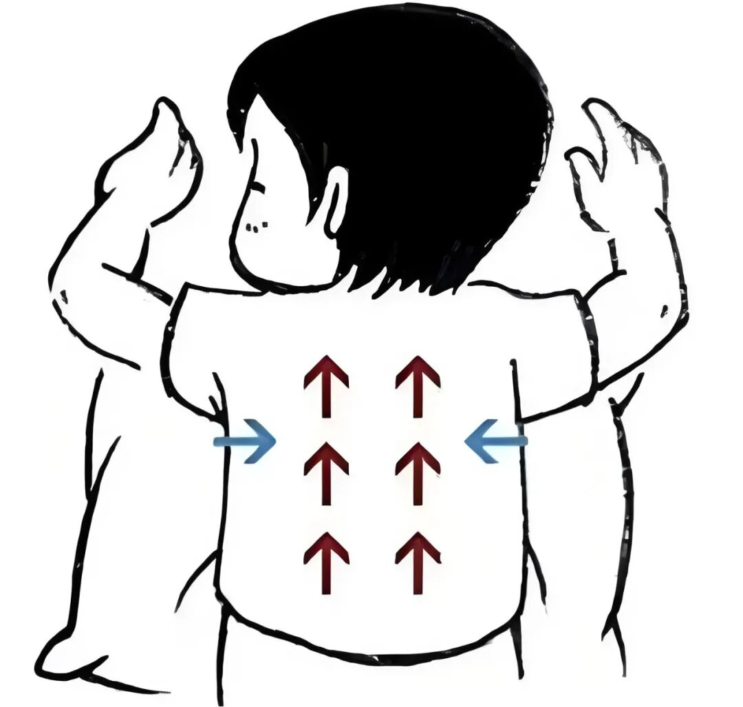 ②位置:避开脊柱和腰肾部位,从下往上、从外侧向内,有节奏地拍打孩子背部。