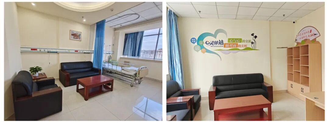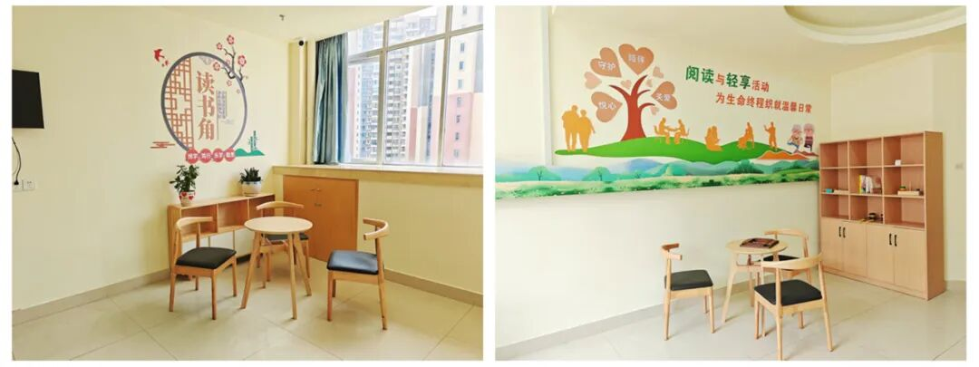 ①舒适的疗愈空间:安宁疗护病区设计理念是以“人文关怀为核心、生命尊严为导向”,通过环境的“去医疗化”“情感化”和“功能适配”,将医疗空间转化为生命尊严的守护空间。安宁疗护病区内设有单间套房、活动室、读书角和心灵驿站等,让终末期患者在温馨、舒适氛围中放松身心,缓解焦虑情绪。
