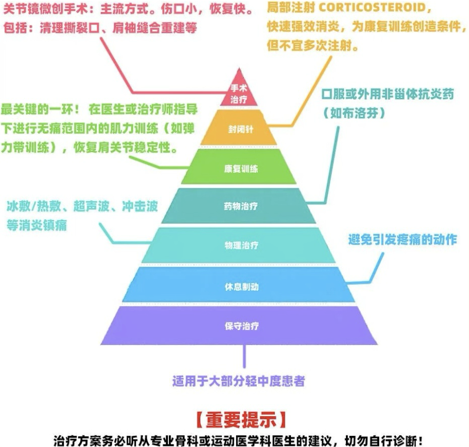 ②休息:避免引起肩部疼痛的动作,给肌腱修复的时间。
