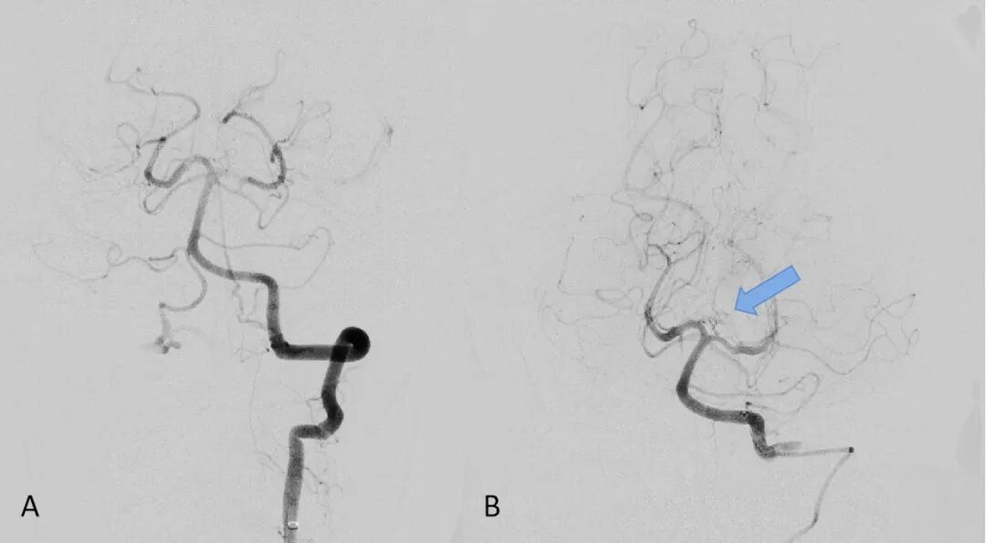 ▲A显示左侧大脑后动脉P1段显影模糊、Percheron动脉显影不清;B显示Percheron动脉正常显影