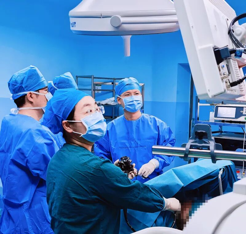 ▲吴乾龙医生(右一)与消化内科顾竹君医生携手开展双镜联合(LECS)胃肿瘤根治术,实施肿瘤精准切除