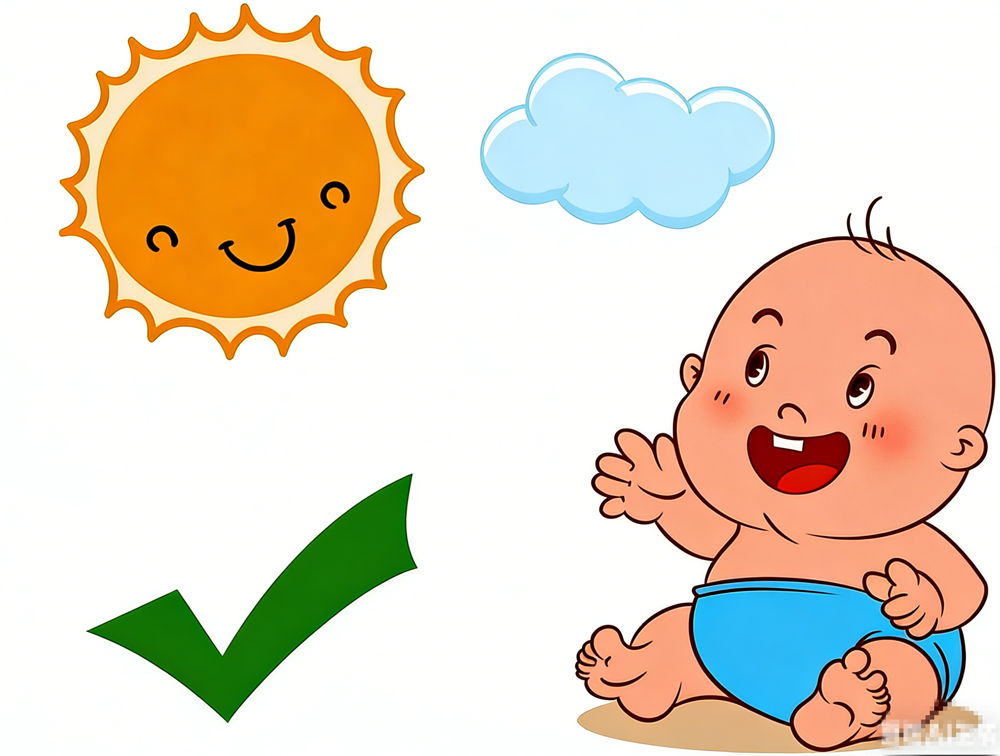 夏季:9:00-10:00前结束晒太阳,避免后续气温升高、紫外线变强,导致宝宝中暑或晒伤。