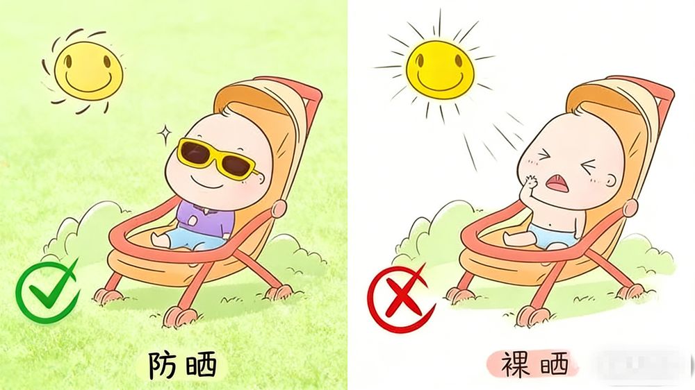 3.误区三:全身上下“无差别晒”——宝宝视网膜尚未发育完全,阳光直射会损伤视力,必须避开眼睛(可戴浅色遮阳帽);3个月内宝宝头颅骨骨板薄、毛发稀疏,头部也需适当遮挡,避免紫外线直射。