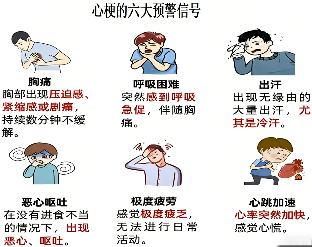 2.心梗核心预警信号:典型症状为胸骨后或心前区压榨样疼痛、憋闷感,持续30分钟以上不缓解,可放射至左肩、后背、颈部、下颌;非典型症状易被忽视,如上腹部疼痛、恶心呕吐、出冷汗、极度乏力、呼吸困难、牙痛,即使症状轻微,也需高度警惕,尤其是既往有冠心病病史的患者。