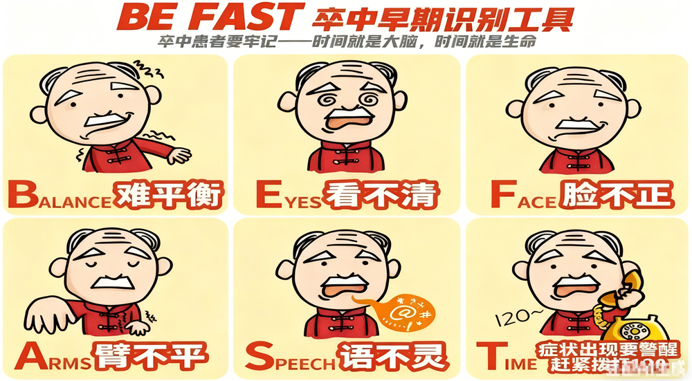 3.脑梗核心预警信号:牢记“BE FAST口诀”快速识别,错过黄金救治时间悔之晚矣。