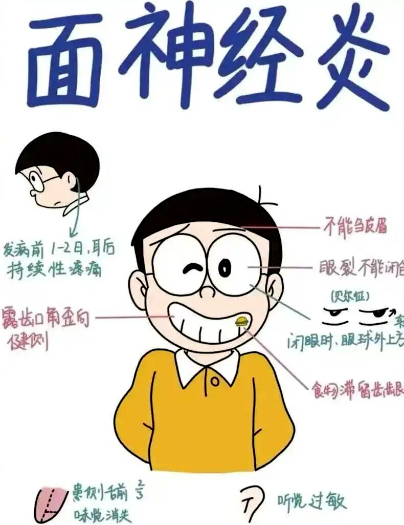 主要症状包括:一侧面部下垂,口角歪斜;眼睛无法完全闭合;额纹消失,无法皱眉;味觉减退或异常;对声音敏感度增加;耳后或下颌角疼痛。