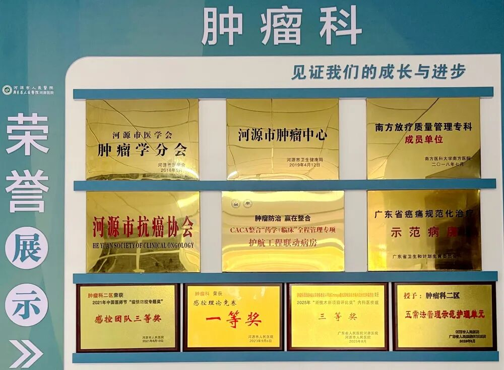 我院肿瘤科是河源地区起步最早、规模最大、综合实力最雄厚的肿瘤综合诊疗学科。科室现有医护技专业人员55人,其中临床医生15人,硕士及以上学历者占14人;职称结构完善,含主任医师1人、副主任医师5人,在读博士1人。科室现为河源市重点临床专科、河源市肿瘤防治专科联盟牵头单位,先后获评广东省癌痛规范化治疗示范病房(无痛病房)、广东省 CINV 规范化治疗示范病房(无呕病房),持续为患者提供全程规范化抗肿瘤诊疗服务。